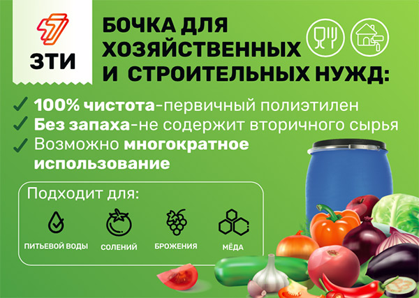Полиэтиленовая пластиковая бочка ЗТИ Open Top 65 л — пищевая емкость, т.н. евробарабан, подходит для хранения воды и других пищевых продуктов, питьевой воды, для засолки продуктов, виноделия, брожения, меда и т.д.